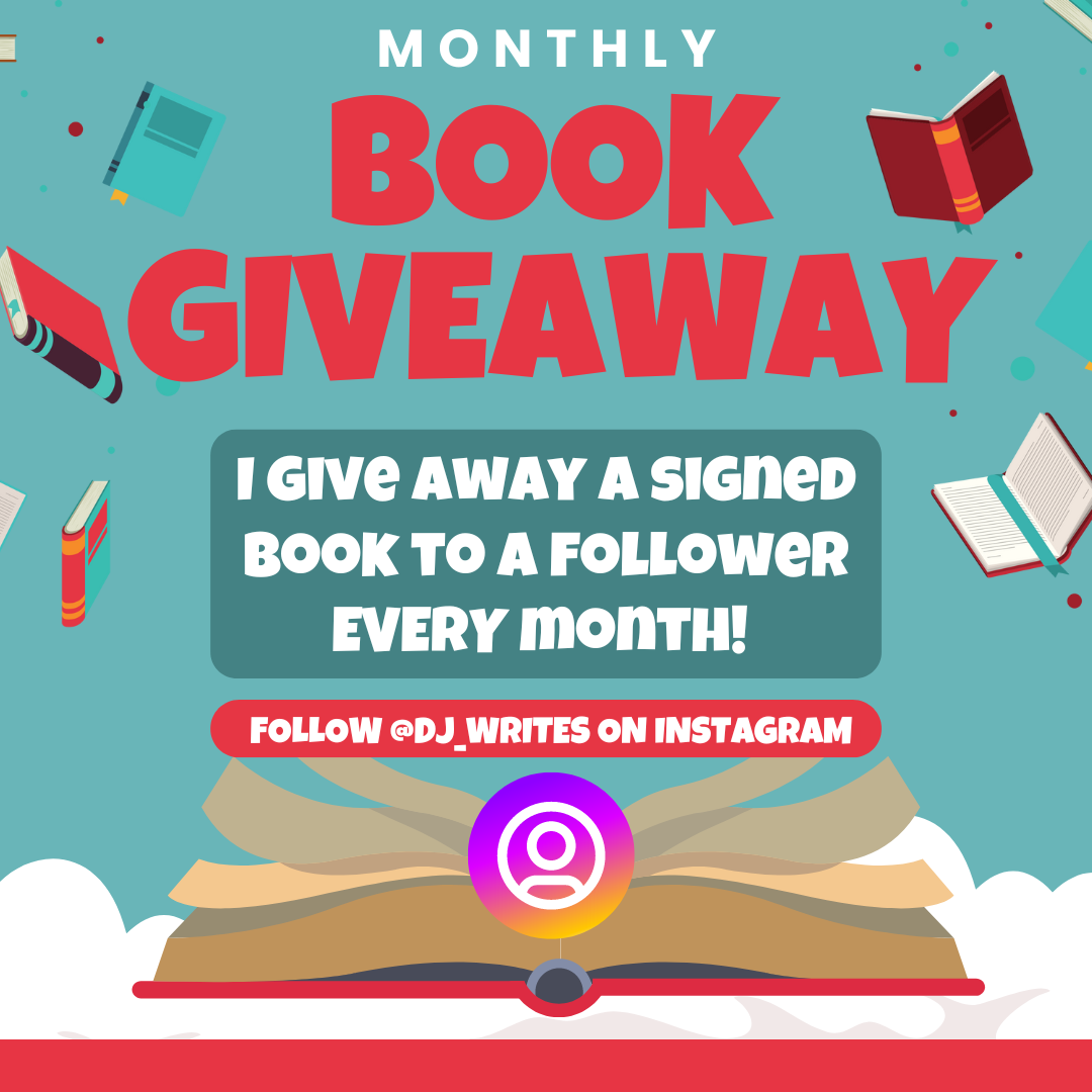 I give away a signed book to a follower every month on my Instagram account @dj_writes. Follow to see this month's entry. Always free!