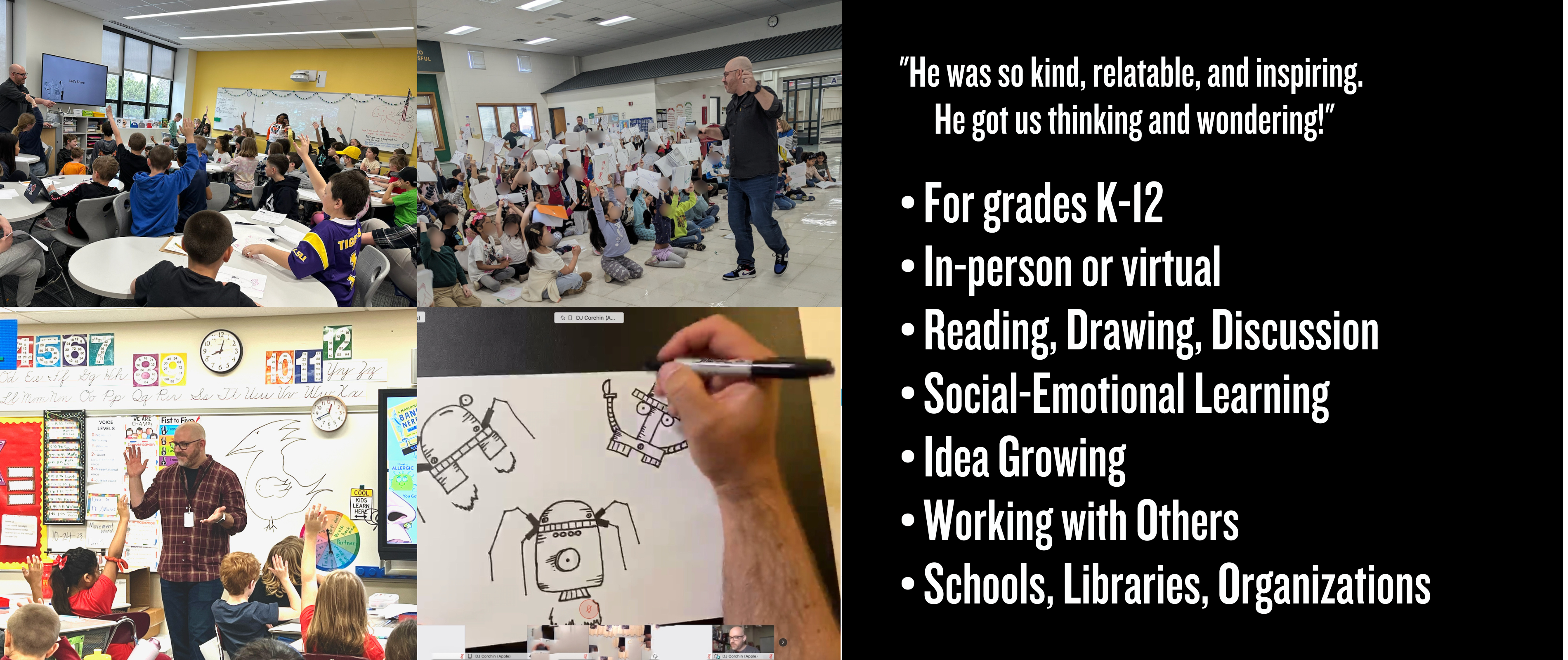 "DJ Corchin was incredibly engaging with the students. He brings an energy to a virtual presentation that is not always easy and the students responded with full engagement! DJ's book A Thousand No's has a very relevant message for our students in today's virtual world. Often times students struggle to stay motivated and DJ's message challenged them to take those negative things in their world right now and find the positives! Our students particularly liked seeing the pages of DJ's books presented along with the process of how he wrote them. The early copies compared to the final products were awesome. DJ shared the story about talking to one of his favorite authors and said that he wanted to be a writer- but it was brought to his attention that he already was a writer. His phrase "Do What you Want to Be" showed the kids that what they do makes them be whatever it is they want to be! Our school can't wait to invite him back to share his stories with more students."